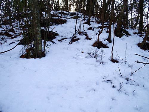 雪の中に道らしきものが3本付いている。地形図の卍マーク(法導院)すぐ北東の下の溜池