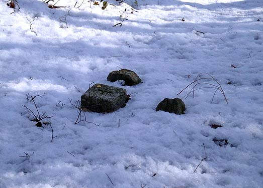 上に飛び出す(9時25分)。積雪10cm、やや平らな頂上部の真ん中に四方を石で囲ま