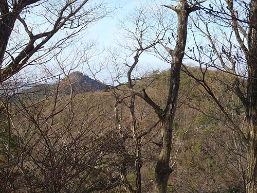 雑木に囲まれて展望はよくないが静かな山頂である。樹幹越しに去年登った清水山、その左