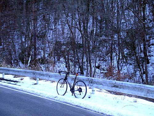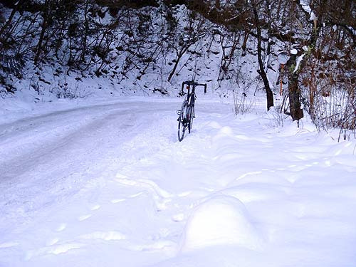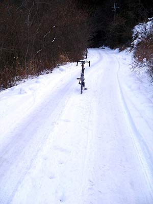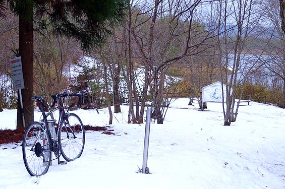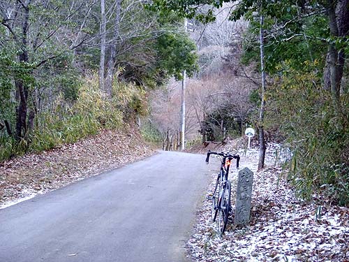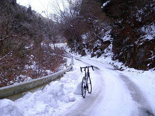 ここまで来ると道路脇に積雪が目立つようになる。亀岡方面から走ってきたサイクリストと