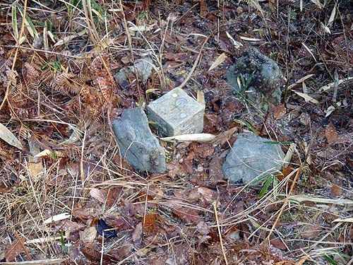る(9時48分)。雑木ヤブのコブの頂上部に三角点は埋まっている。発見するのに少し手