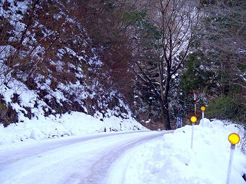泉郷峠への上りにかかる。徐々に道路脇の雪が走行ラインに近づいてくる。峠の頂上までは